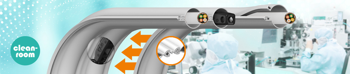 I cavi per cleanroom devono rispettare requisiti elevati. I componenti in movimento devono essere particolarmente resistenti all'abrasione: ogni contaminazione rischia di pregiudicare il prodotto e il processo, e potrebbe comportare elevati costi. All'interno della camera bianca vengono creati continui flussi d'aria per eliminare anche le più piccole particelle. Scegliendo prodotti resistenti all'abrasione, ossia prodotti che rilasciano poche particelle, non serve prevedere complessi e costosi sistemi di eliminazione delle particelle.