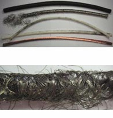 Die Untersuchungen (Zerlegen der Leitung) wurden in jeweils drei Teilbereichen der Leitungslängen vorgenommen. Bei dem in Bild 1 dargestellten Muster sind eindeutige Beschädigungen des Gesamtschirm im oberen Drittel der zerlegten Leitung erkennbar.