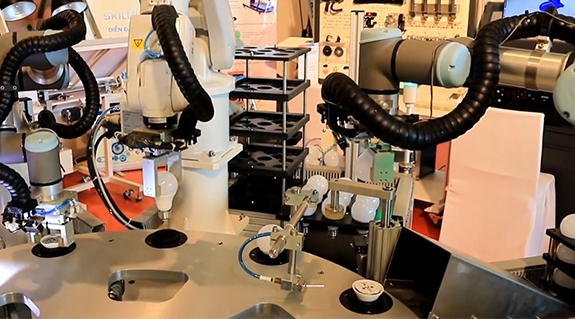 In der LED Birnen Produktion auf engsten Raum helfen sorgen TRE.40.058.0.B in Verbindung mit den UR Metallschellen für eine störungsfreie Energieführung am Cobot