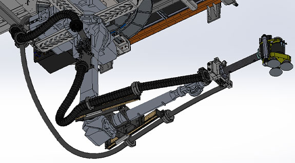 Durch den Einsatz von Cobot Schellen und der 3d beweglichen triflex R Kette TRE ist eine sichere Führung von Leitungen und Schläuchen gewährleistet