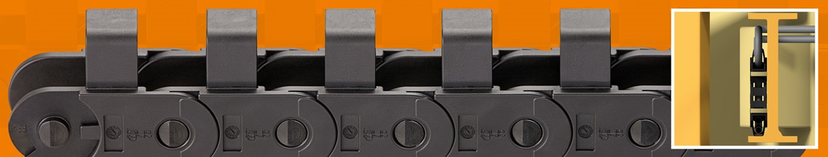 Le guidage sûr des tuyaux hydrauliques dans les béquilles des machines de chantier est essentiel, qu'il s'agisse de pompes à béton ou de grues mobiles, ces tuyaux devant alimenter les machines de manière constante et fiable tant en présence de fortes sollicitations mécaniques que de mauvais temps. La chaîne à étriers E2 permet de guider en toute sécurité des câbles ainsi que deux tuyaux hydrauliques. Elle protège les câbles qu'elle contient tout en évitant une torsion et un pliage des tuyaux grâce au rayon de courbure minimum prédéfini.