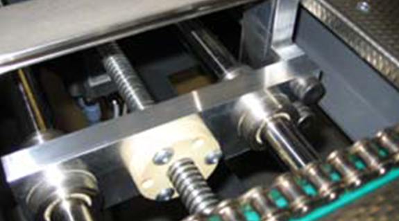 Schmier- und spielfreies Spindel-Mutter-System gewährleistet präzisen Leimauftrag in Kantenleimmaschinen.