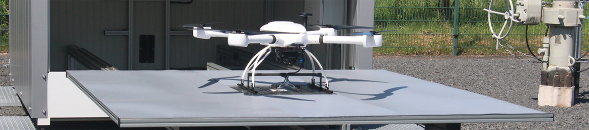 exabotix y offre une alternative. Depuis 2012, cette société met au point des solutions à drones qui sont aussi utilisées par les exploitants de gazoducs. Le drone HD 4-1100 mis au point à cet effet survole les gazoducs de manière entièrement automatique grâce à un logiciel GPS intelligent, les inspecte et signale les anomalies dans le paysage, permettant la prise de mesures adéquates en cas de besoin Comme les gazoducs ont souvent une longueur de plusieurs centaines de kilomètres, un drone ne suffit pas et ils sont nombreux à se partager la tâche. Pour positionner les drones au bon endroit avant que le vol d'inspection ne commence, exabotix installe des hangars à drones à intervalles réguliers le long du tracé du gazoduc. Lorsque l'ordre de décollage arrive du poste de contrôle, les volets roulants s'ouvrent et permettent à une plateforme tenant le drone de sortir. Une fois sa mission terminée, le drone revient se poser sur la plateforme. Les pieds du drone sont équipés de contacts permettant le rechargement de la batterie dès que le drone entre en contact avec la plateforme.