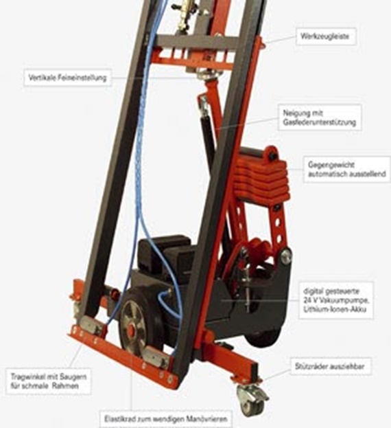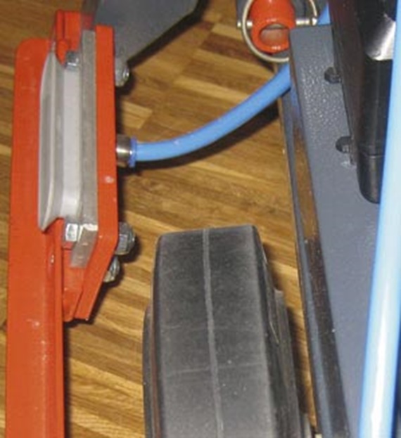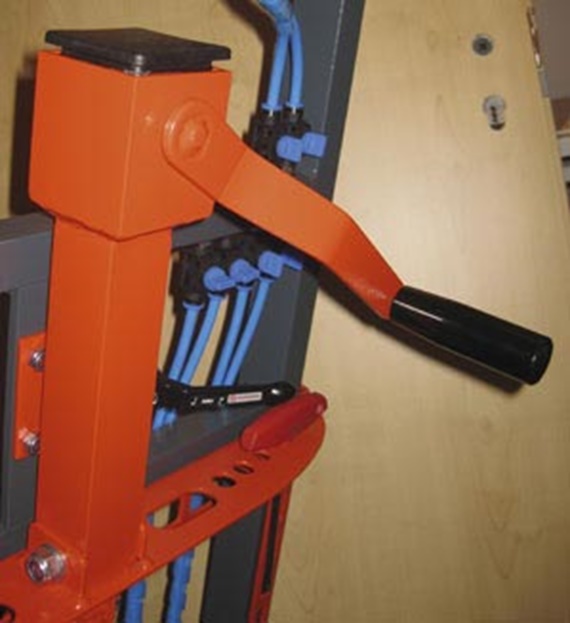 Mit diesem neuentwickelten Gerät kann ein Monteur allein bis zu 120 Kilogramm schwere Türblätter montieren oder transportieren. Da das „Portamobil“ in Kleinserien hergestellt werden soll, werden zur Herstellung hauptsächlich Standardbauteile eingesetzt, die entsprechend günstig sein sollen. Die Lagerung der Kurbelwelle sollte wartungs- und schiermittelfrei ausgeführt werden, damit auch die Türen nicht verschmutzt werden. Hier kommen Flanschlager aus iglidur® G zum Einsatz. Weiterhin sind im Gerät igubal®-Axiallager SAM zur Führung der Trapezspindeln und im Fahrwerk Polysorb-Tellerfedern von igus® verbaut.
