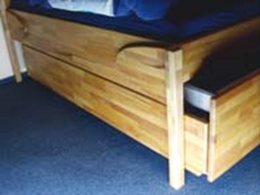 Diese pfiffige Anwendung schafft mehr Stauraum unter dem Bett. Die Schublade ist dabei nach drei Seiten ausziehbar. Realisiert wird diese Möglichkeit durch ein nicht sichtbares Schienensystem mit drylin® W-Linearführungen. Eine weitere Herausforderung bestand in der Kombination von Holz mit Aluminiumprofilen, da diese sich bei Temperaturänderungen unterschiedlich ausdehnen. Dies wurde mit pendelnden Lagergehäusen gelöst.