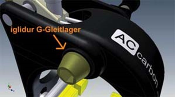 Äußerste Leichtigkeit ist das wichtigste Kriterium beim Bau einer Rennradbremse. Zum Einsatz kommen hier daher ausschließlich iglidur® G Gleitlager, die es ermöglichten, das Gewicht der Bremse auf unter 100 Gramm zu reduzieren. Weiterhin sind die Bremsen und somit die Lager allen Umgebungsbedingungen ausgesetzt und müssen auch bei Hitze, Nässe oder schlammbespritzt zuverlässig funktionieren. Die Wartungsfreiheit der igus®-Lager war ebenfalls ein wichtiger Faktor bei ihrer Auswahl.