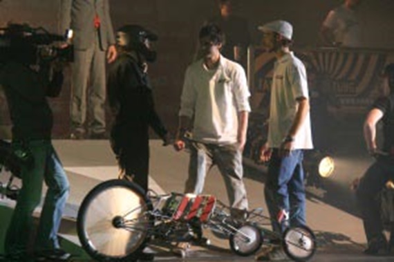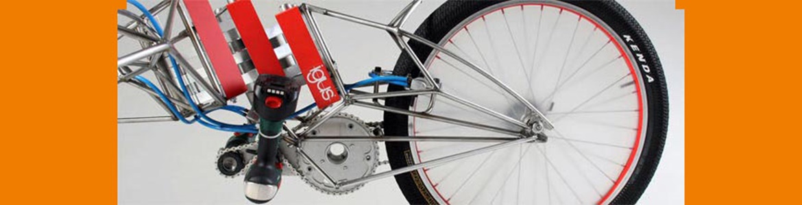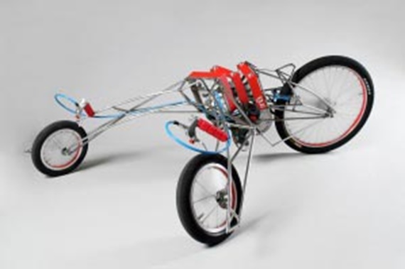 Diese ungewöhnliche Konstruktion für ein Liegefahrrad hat es in sich. Die Konstruktion schwenkt in der Mitte über eine Hebelkaskade. Der Fahrer liegt darüber und steuert das Fahrzeug durch Verwindung seines Körpers. Als Antrieb dienen hier Akkuschrauber.