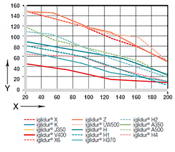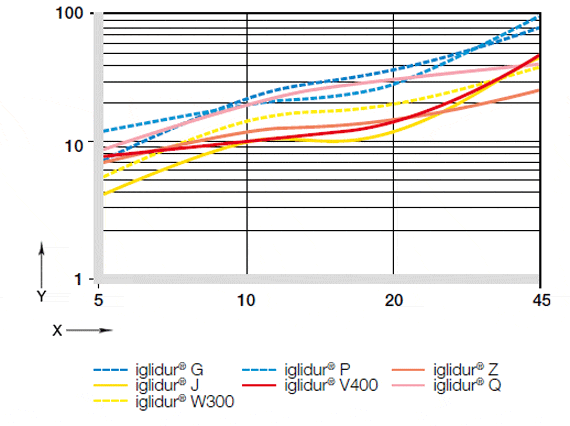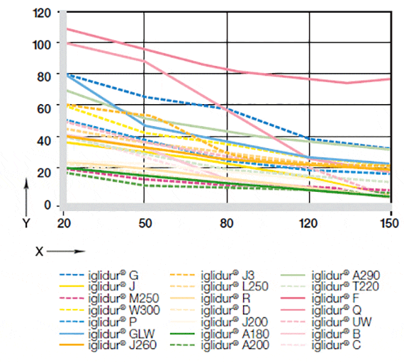La pression de surface maximale [p], statique à +20 °C, constitue un paramètre important des matériaux iglidur®. Cette pression varie très fortement d´un palier lisse iglidur® à l´autre. Le paramètre [p] donne la limite de charge d´un palier. Cette charge, le palier peut y être soumis en emploi continu sans détérioration. La valeur indiquée s´applique à une pression statique et les vitesses admissibles ne doivent pas dépasser 0,01 m/s à cette charge. Des charges supérieures sont possibles, à condition toutefois que le temps de sollicitation soit courte. Veuillez nous contacter en cas de questions.