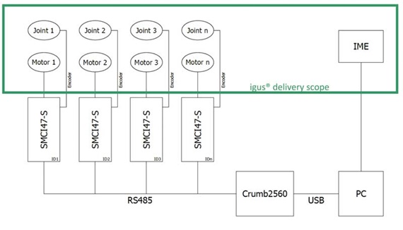 motori passo passo igus®, numero corrispondente al numero di assi del braccio