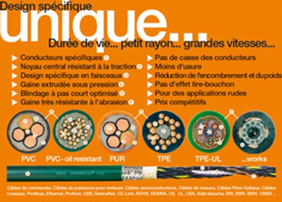 Control cables, Motorcables, Servo cables, Measuring system cables, Fibre optic cables, Koaxcables, Profibus, Ethernet, Profinet, USB, DeviceNet, CC-Link, ROHS, DESINA, CE, UL, CSA, Cleanroom, 30V, 300V, 600V, 1000V ...