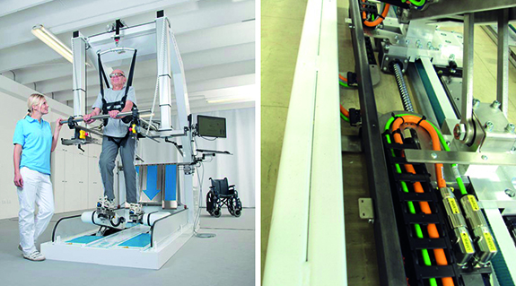 Der Therapie-Roboter hilft Patienten nach einer OP, wieder laufen zu lernen. e-ketten und chainflex Leitungen ermöglichen hier geringste Bauhöhen und Biegeradien.